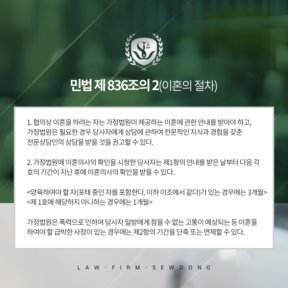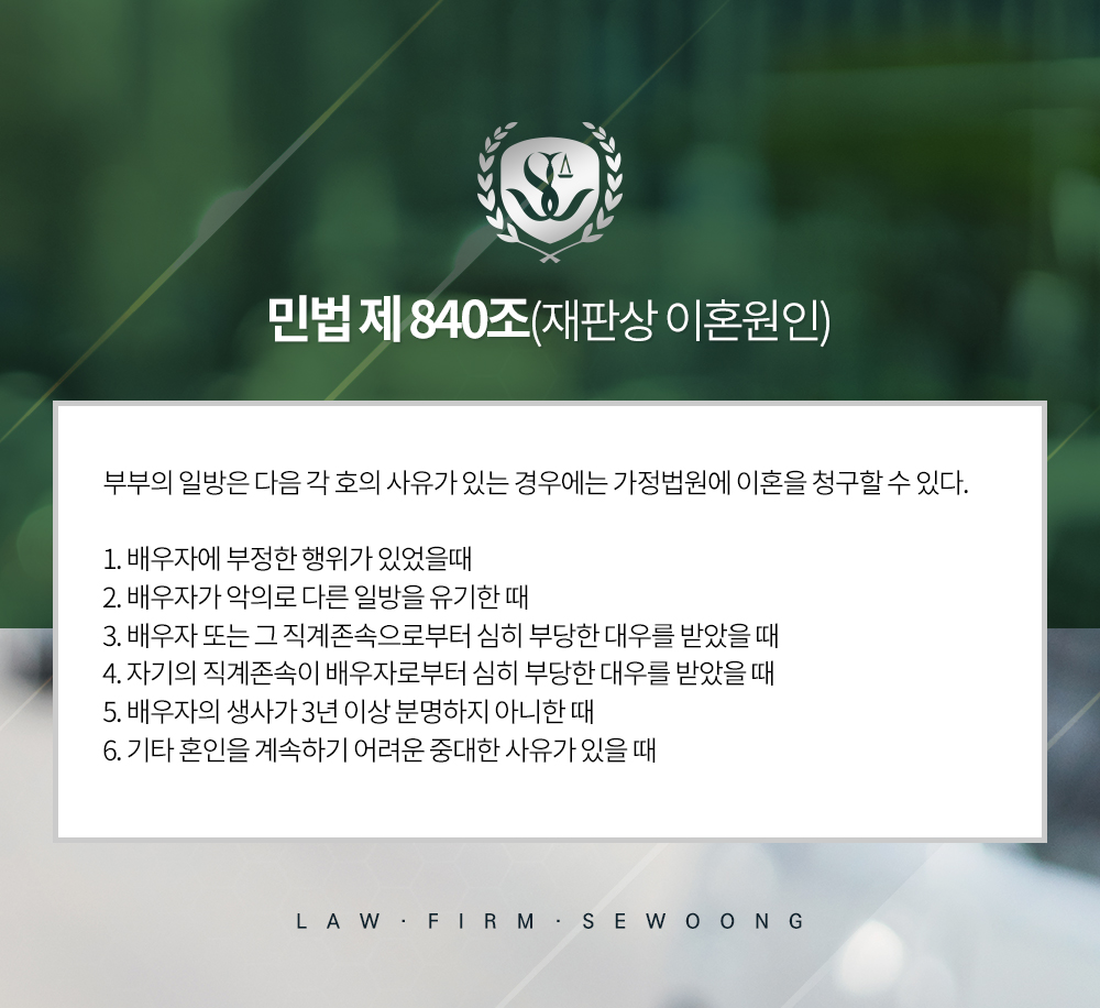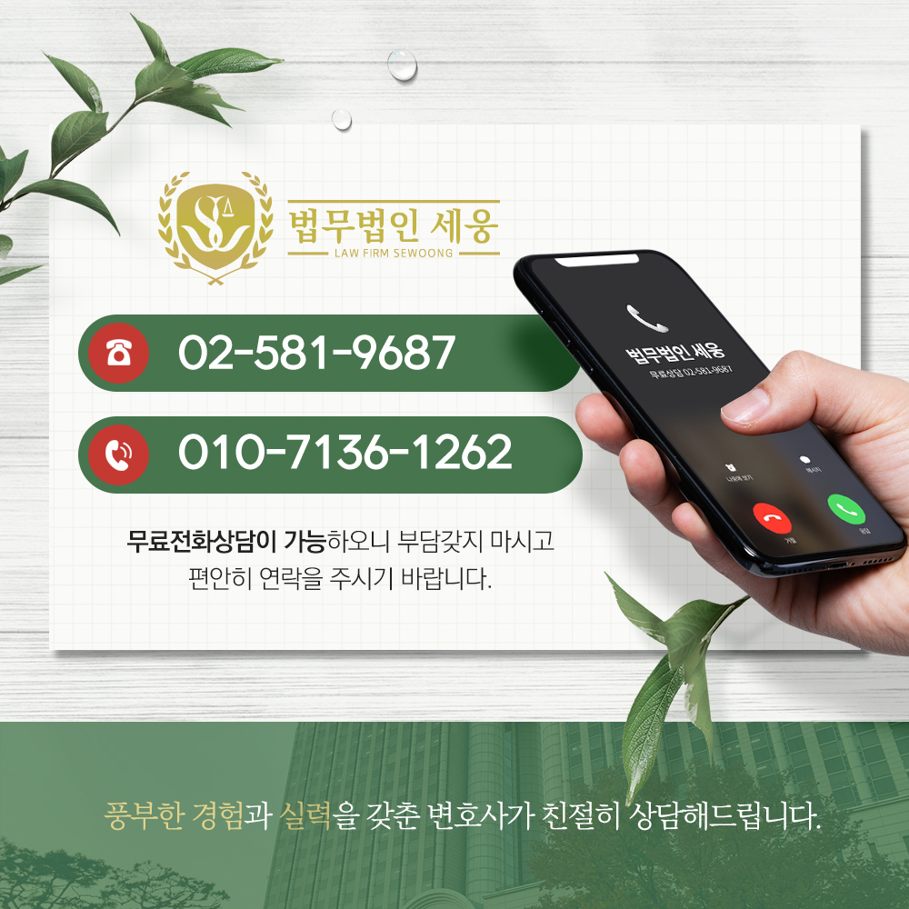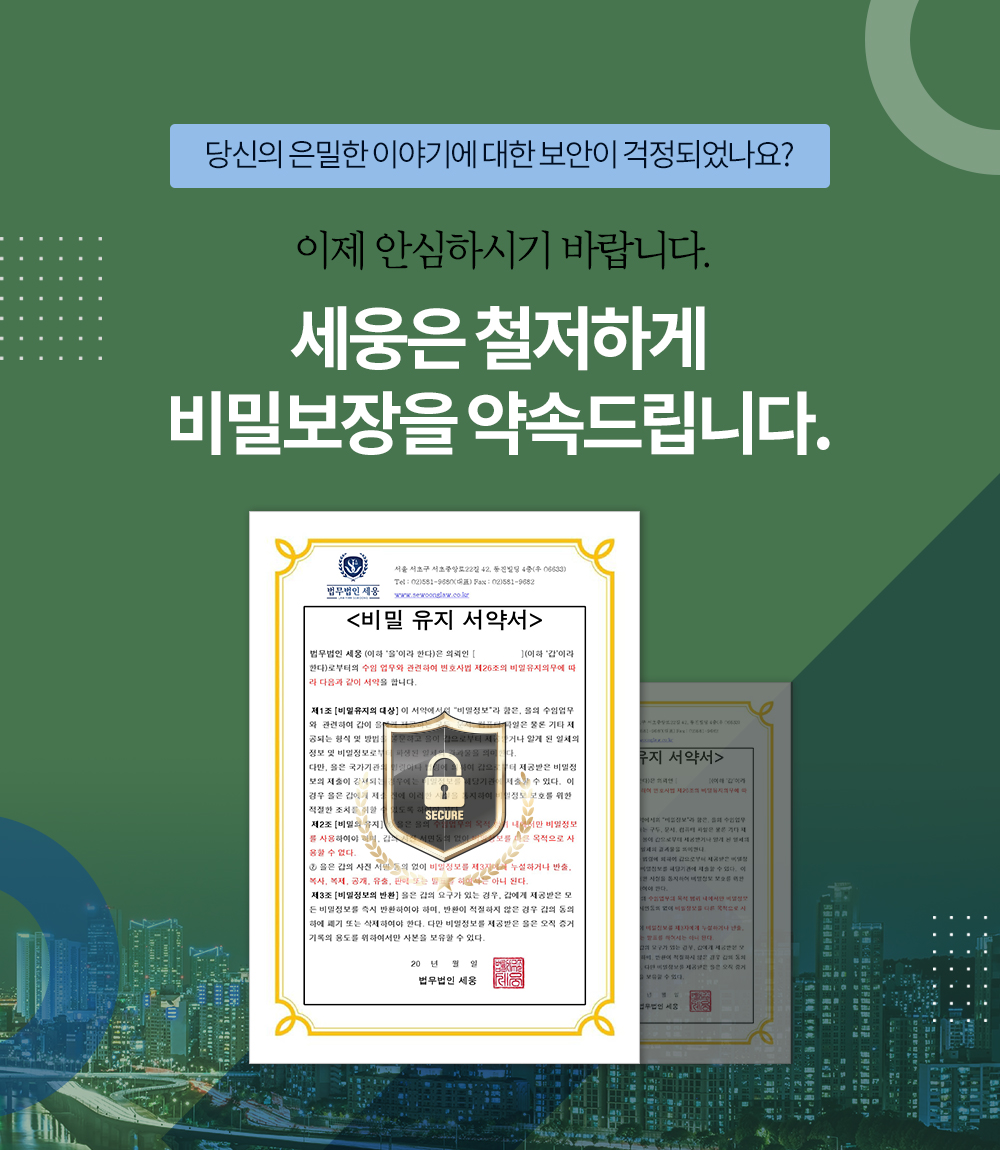 법무법인 세웅 가사전담센터에서는 위와 같은 일로 어려운 시기를 겪고 있으신 분들에게 가장 신뢰할 수 있는 법률서비스를 제공하고 있습니다. 이제 당신의 지치고 상처받은 마음을 세웅의 법률전문가들로부터 치유받기 바랍니다.